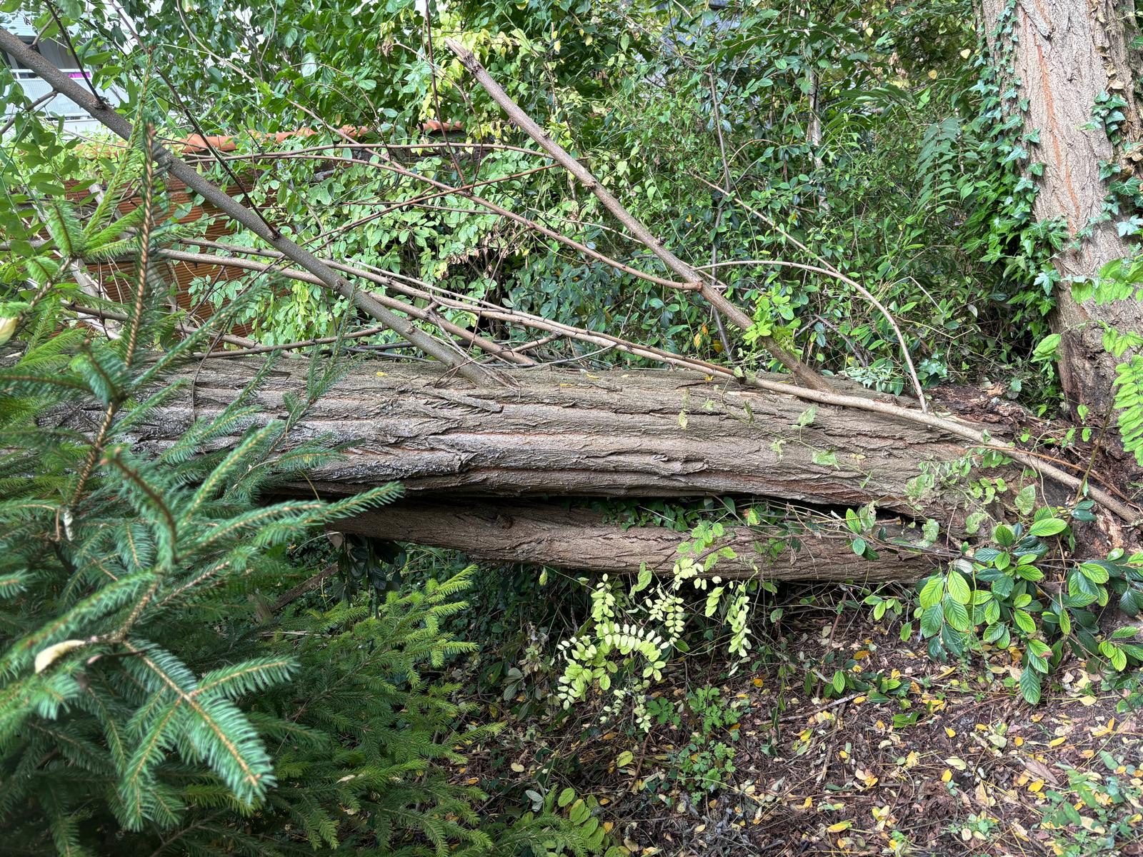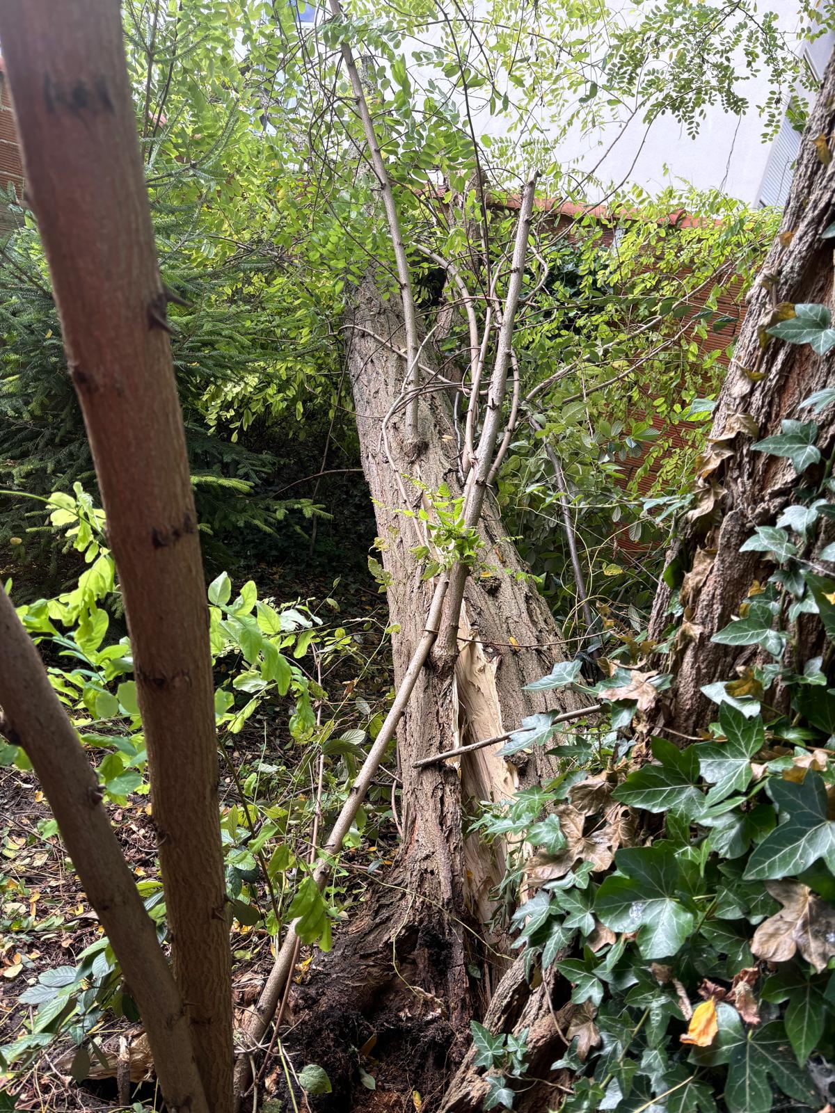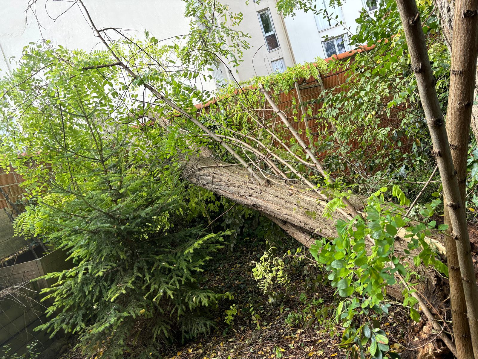 Un arbre tombé sur un mur en briques, Heureusement plus de peur que de mal, le propriétaire aura du bois de chauffage gratuit.