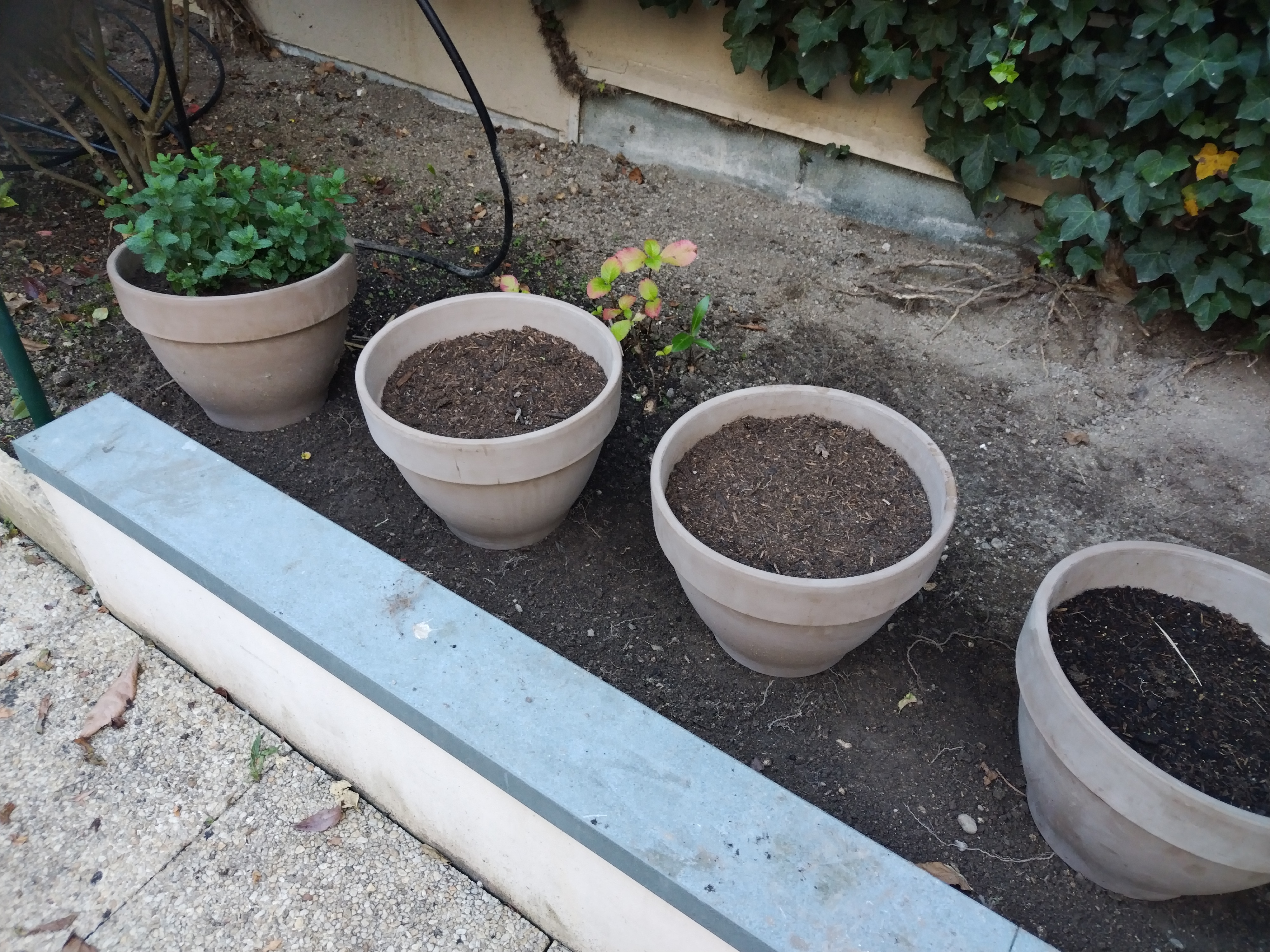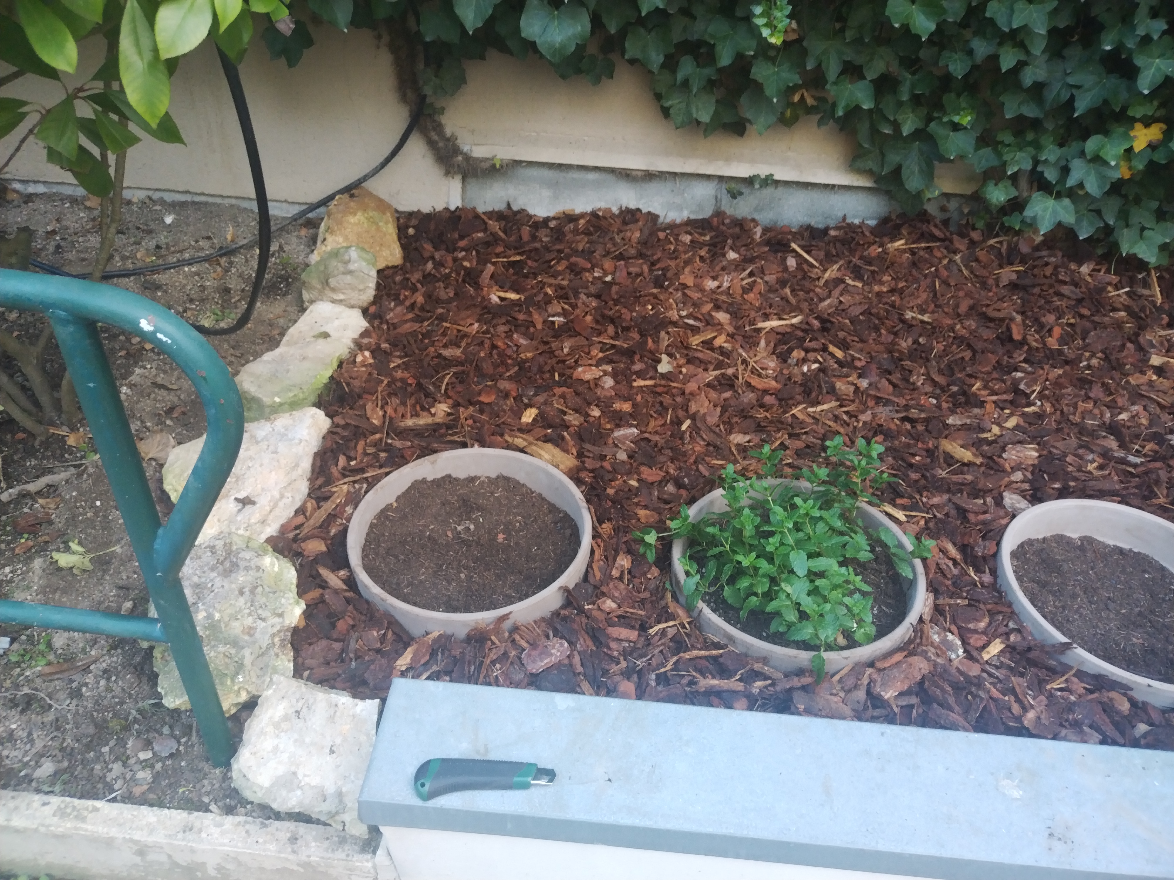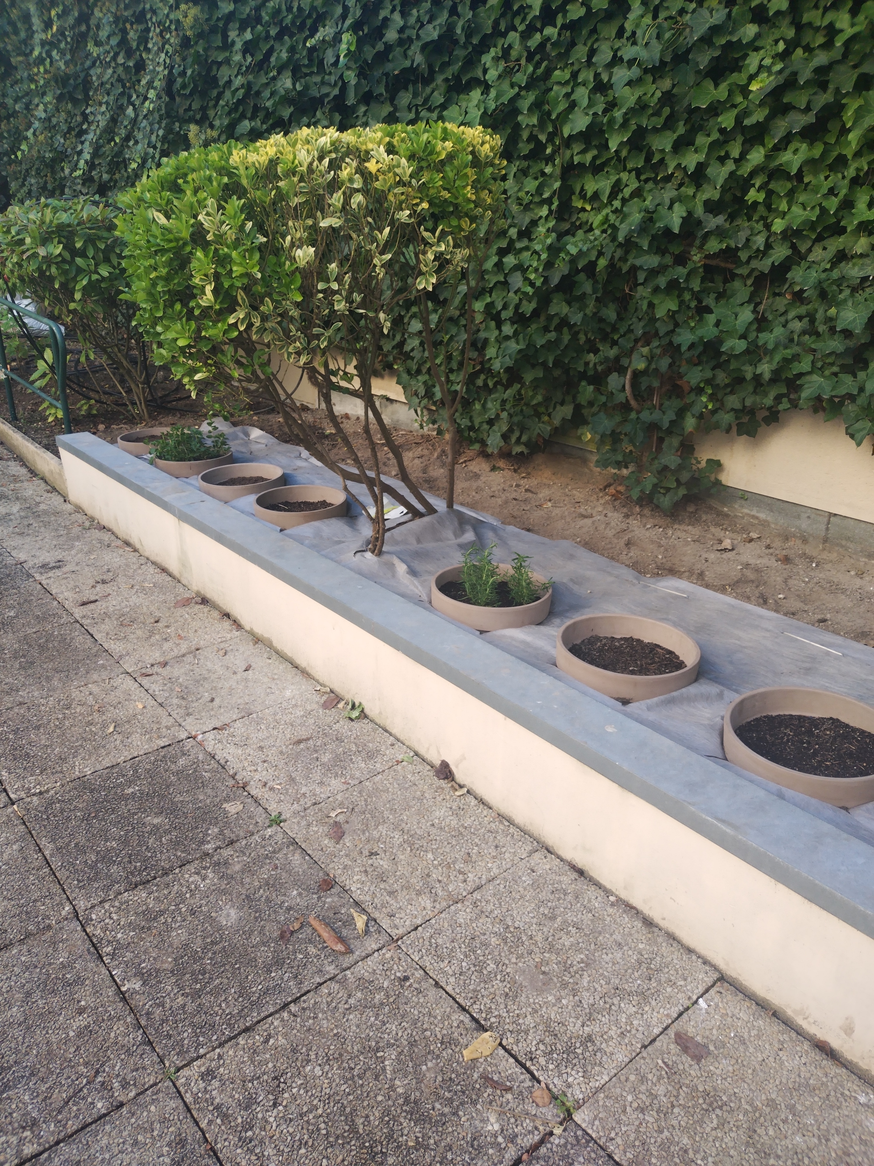 Un projet de création pour une maison de retraite: des pots d'herbes aromatiques, afin d'éviter la pousse des mauvaises herbes un geotextile et un paillage sont mis en place.